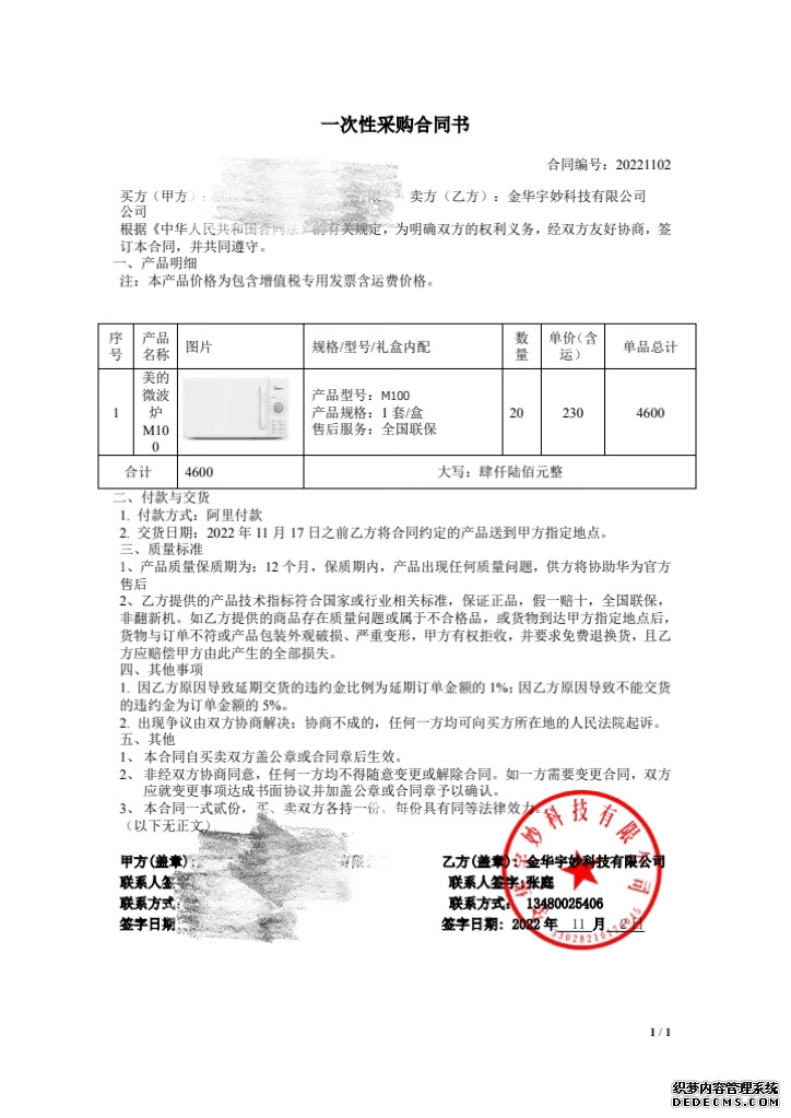 11月2日,她于1688平台上一家名为“金华宇妙科技有限公司”的店铺购买了20台单价230元的美的微波炉,按照双方签订的“一次性采购合同书”,卖家承诺在15天内完成交货。11月6日,陈女士发现该店铺已不存在,便第一时间联系了平台客服。“客服告知我店铺未关闭,商家随后又回复我仓库已经排单,6天左右可以发货。”合同规范、回复及时确切,这让陈女士暂时打消了不安和怀疑的念头。