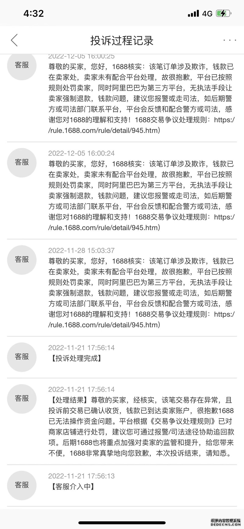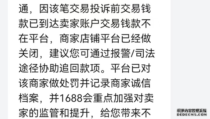 龙先生的经历与陈女士如出一辙。他于11月3日下单了一款价值2500余元的英特尔处理器,显示“已发货”后,商品于11月14日期满自动签收,随后,这家名为“汕头市澄海区一沐商行”的店铺便迅速消失了。而在经历了漫长的维权投诉历程后,龙先生仅仅得到1688平台反馈:钱款已在卖家处,卖家未有配合平台处理,故很抱歉,建议您报警或走司法。